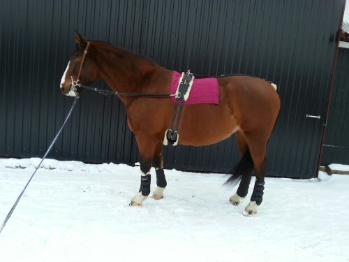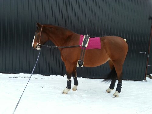 Tysk longergjord med inspänningstyglar, svanskappa och fårskinn under däckel, maggjord och under svansen. Vet inte märket på något av sakerna.