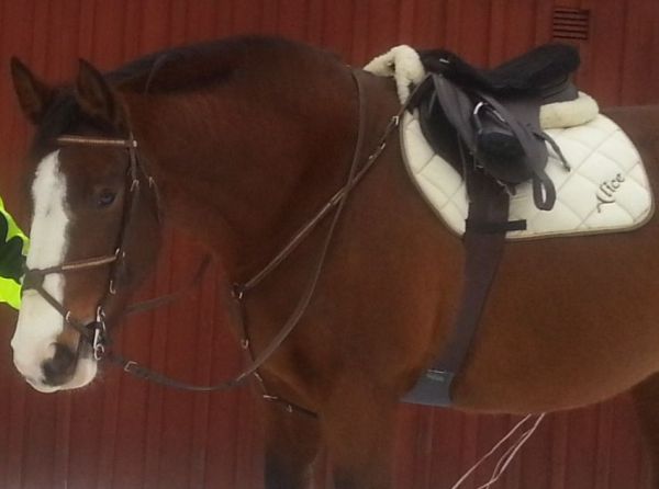 Thorowgood T6 Robert Whitaker hoppsadel med dubbelsydda Stübben stigläder, Sprenger Bow Balance stigbyglar, Eric le Tixerant sadelgjord, Lyckås schabrak (broderat med ”Alice”) och HKM fårskinnspad.