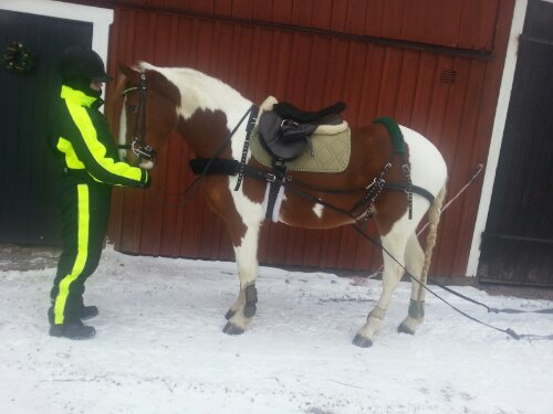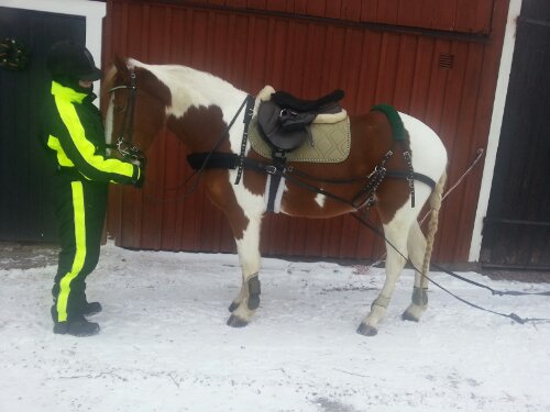 Thorowgood T6 hoppsadel (Robert Whitaker), med dubbelsydda Stübben stigläder, Sprenger Bow Balance stigbyglar, anatomisk sadelgjord i sympatex med teddyfoder, Showmaster schabrak, HKM fårskinnspad samt Lippo rumpvärmare i teddy.