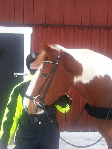 Ihopplockat träns med en bridongrem, bygelnosgrimma (som ska säljas då den vart för liten för Dingo), Claridge House blingpannband, lädertyglar med gummi på insidan samt ett tredelat parerstångsbett som är köpt på Ge-Kås.