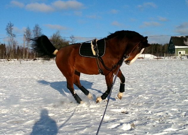 Ja, vem kan rubriken syfta på? Alice, såklart. Imorgon ska jag rida lektion för Therese igen och det är Alices tur denna gång. För att kunna rida henne utan någon större risk för explosioner (som det blev i lördags) så har jag varit tvungen att försöka få bort så mycket överskottsenergi som möjligt så igår blev det longering/longeringspromenad med inspänningstyglar och lite tuffare travarbete än normalt. Det var förvisso meningen att jobba bort energi, men det blev ytterligare ett lite tuffare pass än vad som var tänkt på grund av tokfian som – som vanligt – ville visa sin atletiska sida och slängde in diverse akrobatiska övningar och full galopp. Hon fick därför stå lindad med Back on Track-paddar efter det. Benen verkar dock ha klarat sig riktigt bra. SKÖNT!