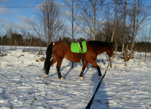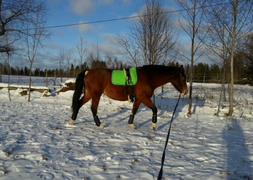 Longerings-/tömkörningsgjord med inspänningstyglar (som jag dock aldrig använde denna gång), fårskinnsunderlägg (tunneln till maggjorden är nog Medilamb alternativt Christ) och HKM fårskinnsludd på svanskappan samt Gold Medal schabrak.