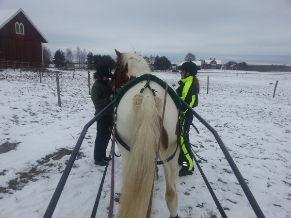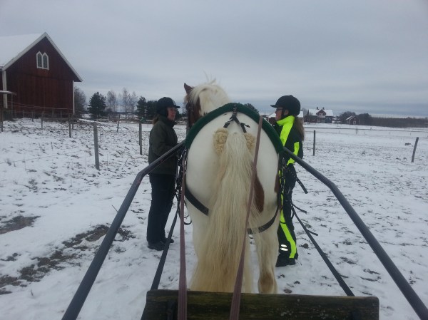 I fredags så fick jag hjälp av Sara och Hilma att vagnträna Dingo för andra gången. Det var ett tag sedan vi gjorde det så han var lite obekväm med att svänga, men efter ett par svängar åt vardera håll så släppte det och då var det inget problem längre! Eftersom han var så lugn efter det så vågade jag mig på att sätta mig i vagnen. Sara och Hilma gick på varsin sida om Dingo hållandes löst i longerlinor som en försiktighetsåtgärd och som moraliskt stöd för Dingo. Men, det var jag som styrde, drev och stannade honom. Och vet ni vad? Det gick SUPER! Han är verkligen jätteduktig och det roliga är att man ser att även han tycker att det är roligt. Han tuffar på som hejsan med öronen spetsade framåt. Älskade lille plutt!