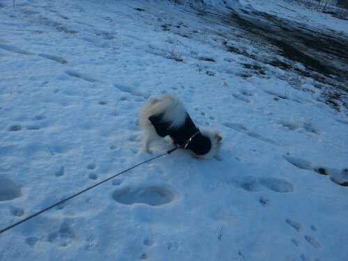 Vilken härlig dag det var idag! Närmare fem plusgrader och strålande solsken. Det gjorde verkligen gott för humöret och mitt allmänna mående. Det märks klart och tydligt att även djuren föredrar sådana här dagar. Alice njuter i fulla drag utan täcke och Gizmo tar snöbad efter snöbad och blir glad och busig efteråt.