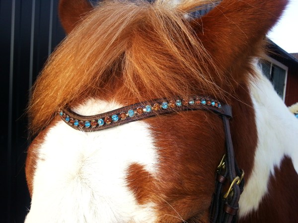 Cliff Barnsby träns med utbytt pannband till ett med swarovskistenar (varannan turkosfärgad och varannan bärnstensfärg) och ett bett köpt från Horze.