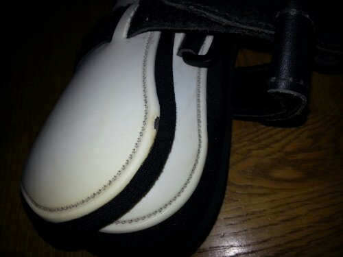 Snygga senskydd i riktigt bra skick då de är använda endast fem gånger. Dock har en liten flis lossnat på ett av skydden – se bild. Storlek full. Utbytbara remmar.