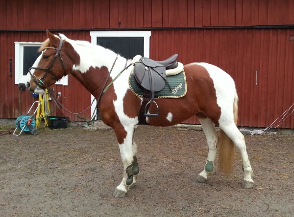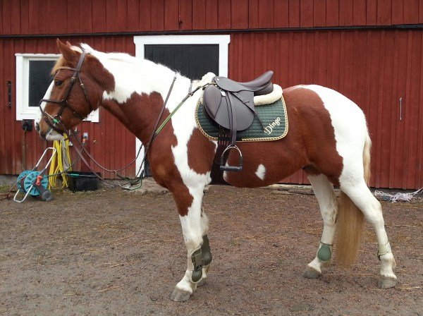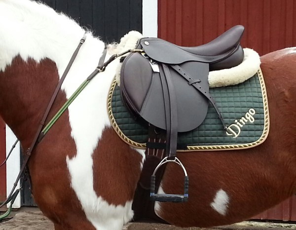 Jag blev jättenöjd med den! Det är den hoppsadel som passar bäst av alla som jag hittills har provat på honom. Den är – kors i taket – tillräckligt kort för hans korta rygg, även om det visserligen är gränsfall även på den. Men, det går ju i alla fall! Snygg brun färg också, som lyckligtvis är exakt samma som på mina dubbelsydda Stübben-stigläder.