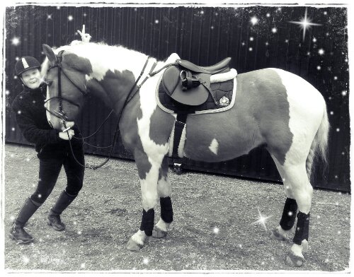 Claridge House hoppsadel med dubbelsydda Stübben stigläder, Sprenger Bow Balance stigbyglar, HKM fårskinnspad, Gold Medal schabrak, anatomisk sympatexgjord med teddyfoder.