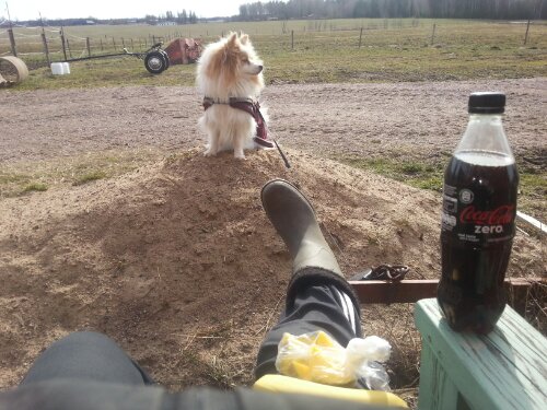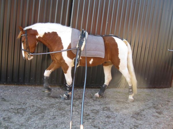 Det blev inget märkvärdigt arbete utan mest lite lätt skrittarbete i en av hagarna. Gas, broms och styrning. Inga svårare övningar än halvhalter, halter och böjning. När han väl hade lugnat ner sig och vi faktiskt kunde ”arbeta” så skötte han sig fint, bara jag var tydlig med vad jag ville.