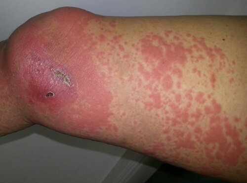 Det började i knävecket och spred sig ganska snabbt runt knät och sedan till resten av kroppen. De drog slutsatsen att det är antibiotikan som är orsaken. Konstigt, dock, att jag hade ätit den i en vecka innan symptomen dök upp? Jaja.