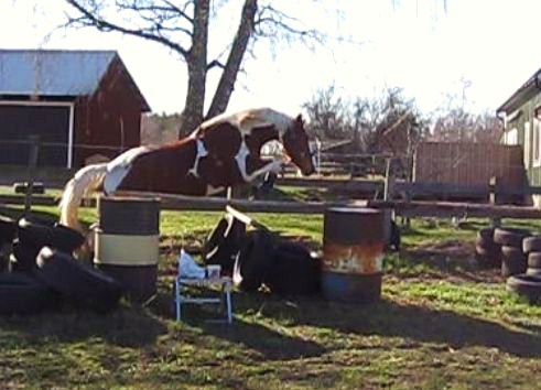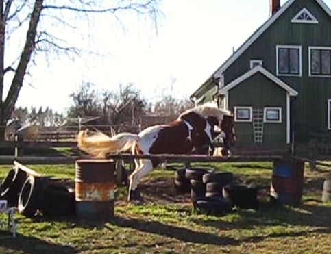 Jag trodde att han skulle vara lugn då han fick springa och hoppa av sig ganska ordentligt igår på löshoppningen, men icke! Han var pigg som bara den! Jag fick bromsa, bromsa, bromsa och lugna, lugna, lugna länge innan han till slut slappnade av. Han var dessutom likadan nu som första gången som jag provade att rida honom barbacka = vinglig. Det svåra med när han börjar vingla och kråma sig är att jag får sitta och parera hela tiden och i och med att jag gör det så ger jag ju honom sitshjälper/signaler och det får honom – som den unghäst han är – att reagera på dem och vingla ännu mer så jag får göra allt jag kan för att sitta så still som möjligt och försöka bromsa, driva och räta upp honom på samma gång. Svårt – ja, men till slut så fungerade det.