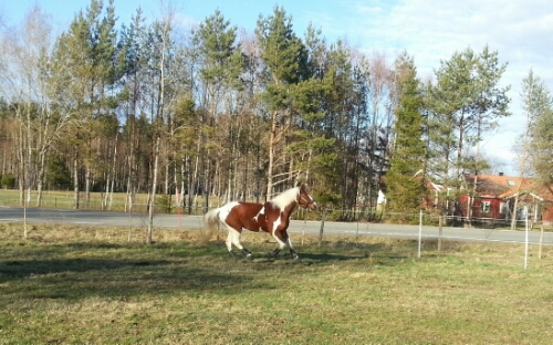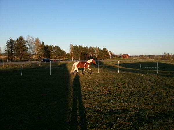 Hur som helst så blev det alltså uteritt. Dingo tyckte att det var jättekul att äntligen få komma utanför gården igen och roligast av allt var ju att träffa en ny häst. Det blev skritt och trav på en riktig piggelin! Den trötta Dingo som knappt gick att få att resa på sig i boxen och som sedan stod och halvsov i stallgången var som bortblåst och istället var den superpigga Dingo som jag känner till så väl tillbaka.