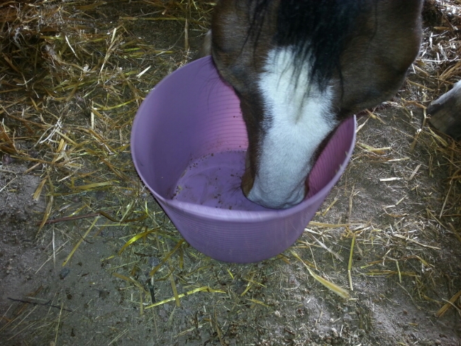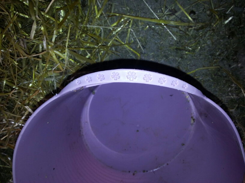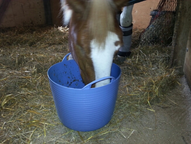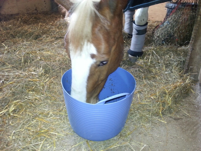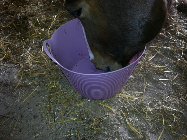 Vad gillar ni hästarnas nya ”krubbor/mathinkar”? Det är sådana där böjliga hinkar/baljor som tål det mesta. De har ätit ur sådana förut, men det har varit den stora modellen, vilket har känts onödigt då ingen av dem får någon större mängd foder. Framförallt Alice får ju ingenting annat än mineralpellets, jäst och någonting gott som morötter, äpple, banan eller någonting sådant.