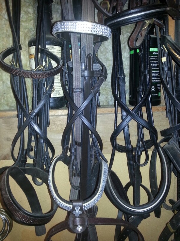 Ihopplockat träns av en Stübben bridongrem, Stübben nosgrimma, okänt blingpannband samt ett parerstångsbett med syntetstång.