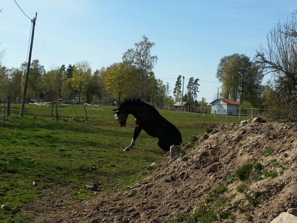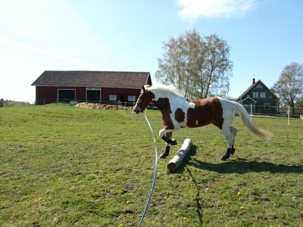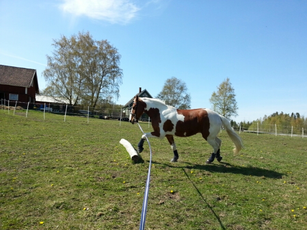 Igår så fick Dingo ett kombinerat longerings- och terrängpass! Jag longerade honom i hagen där han fick jobba upp och ner för banken, skritta och trava över en ”stock” samt hoppa över ett litet nedfallet träd. Han var galet pigg och ibland så hade jag fullt sjå med att hålla honom så det blev i princip inget filmat eller fotat. Men, jag gick tillbaka till banken i slutet på passet – när han hade hunnit bli lite trött – och hade då tillräcklig kontroll för att våga plocka upp mobilen för att knäppa några foton.