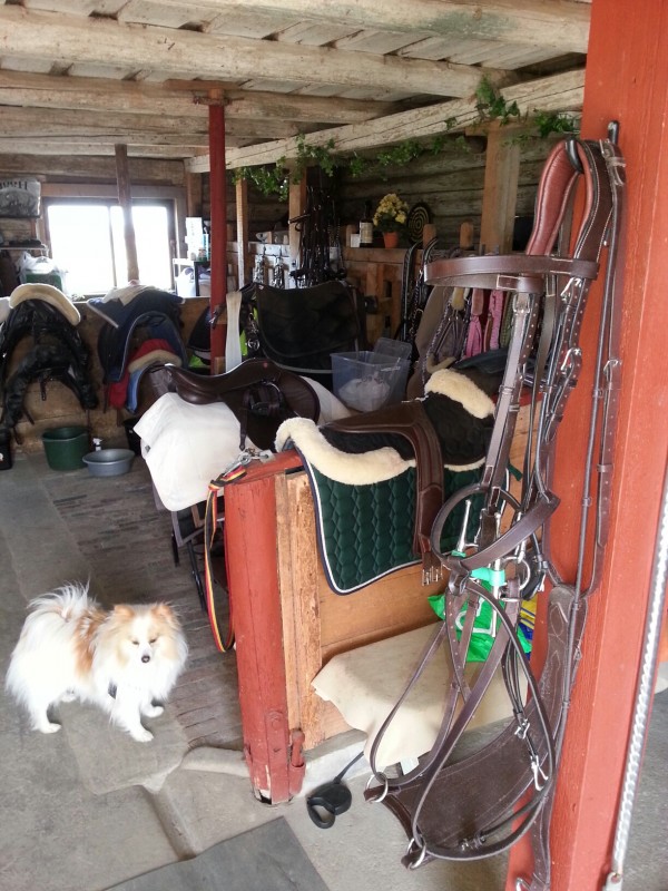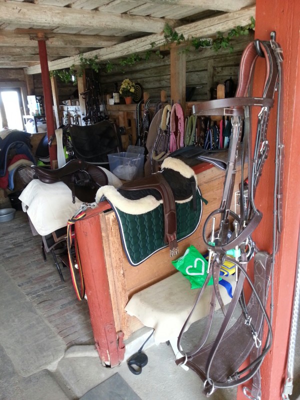 Claridge House hoppsadel med dubbelsydda Stübben stigläder, Sprenger bow balance stigbyglar, HKM fårskinnspad, Horse Saver schabrak samt Böckmann sadelgjord.