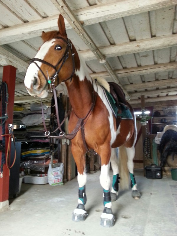 Dyón träns med Claridge House tyglar, syntetbett med parerstänger (kommer inte ihåg märket just nu) samt Horze bib-martingal.