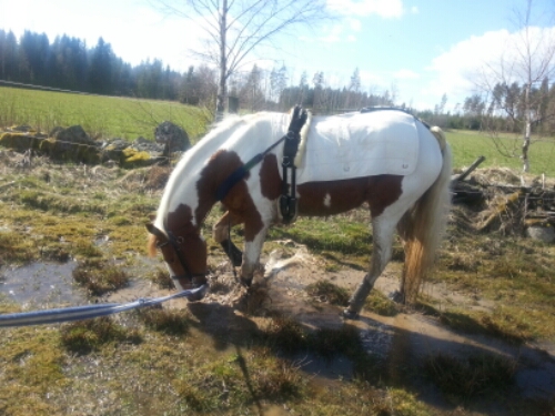 Det var väldigt blött på sina ställen då det har regnat de senaste dagarna. Speciellt på ett ställe så hade det blivit en lite större pöl där han fick träna på att gå igenom vatten när han hade lugnat ner sig. Då fick han för sig att leka i vattnet istället! Sötnöt.