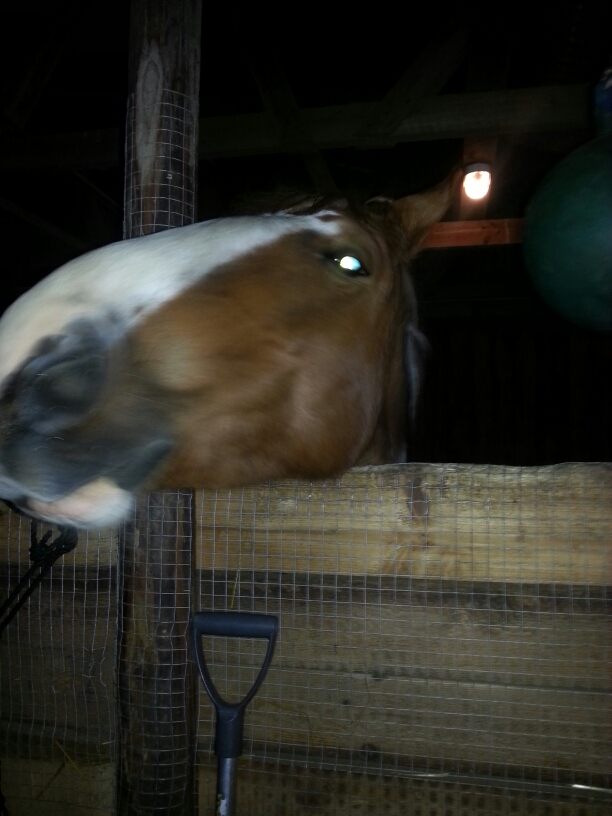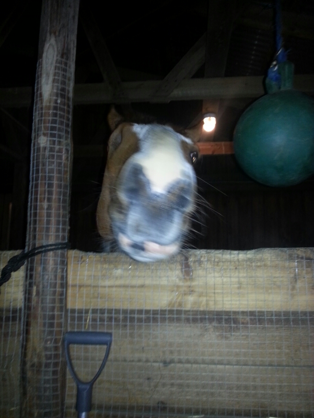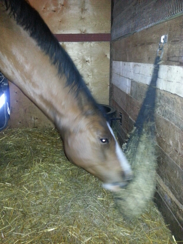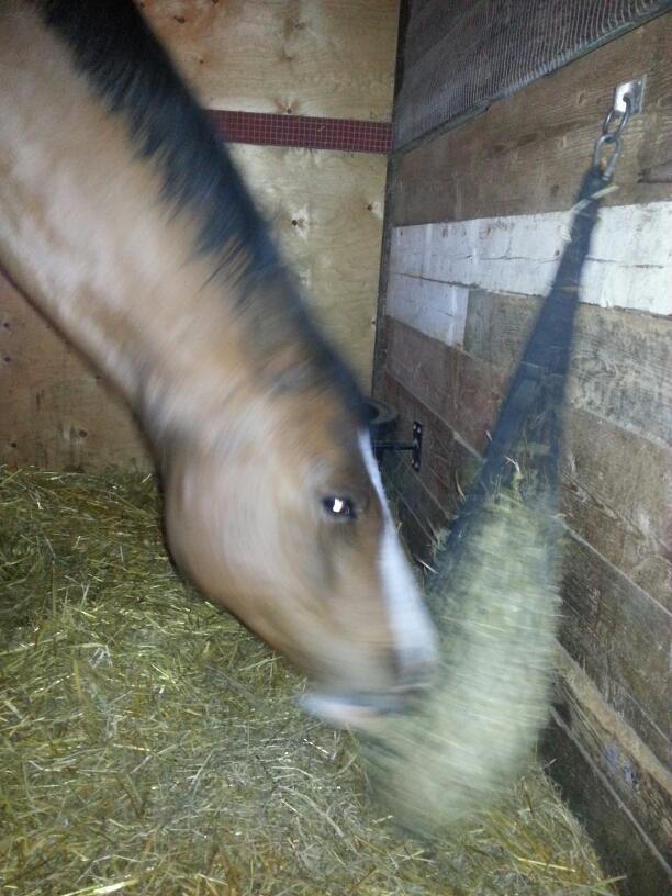 Alice blir alltid lika glad och ivrig när hon får sin lilla hösilagegiva. Det var mindre lätt att ta mobilbilder när hon höll på att dra i hösilaget/nätet hela tiden.