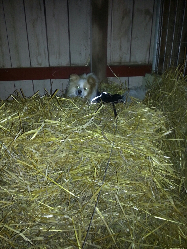 Gizmo var måttligt road över det kalla, blöta vädret och hoppade istället upp i halmen vid första bästa tillfälle.