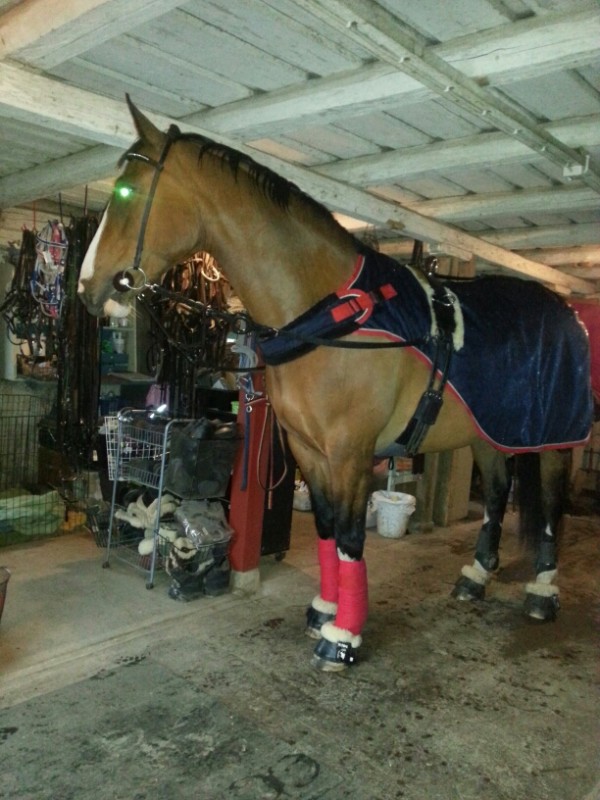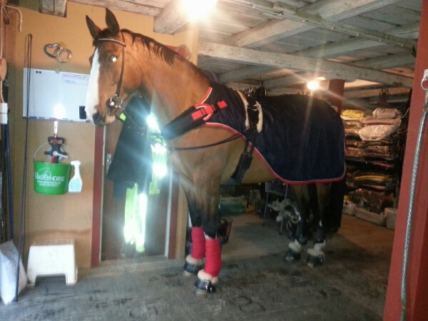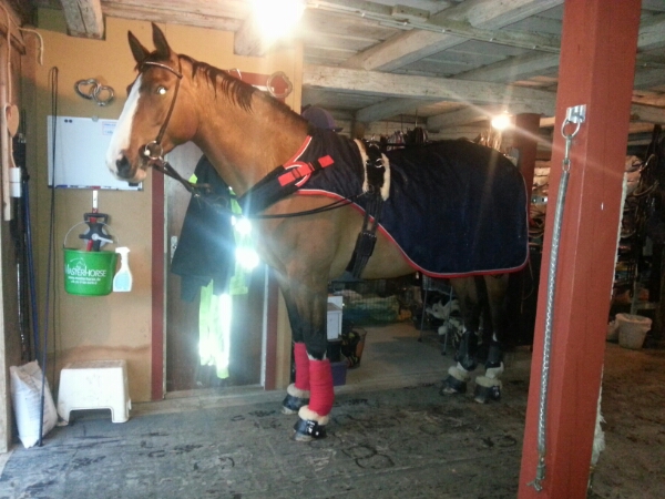 Börjes fleecelindor med Back on Track paddar under ifram, Börjes damasker i bak samt Globe neoprenboots med fårskinn på alla fyra hovar.