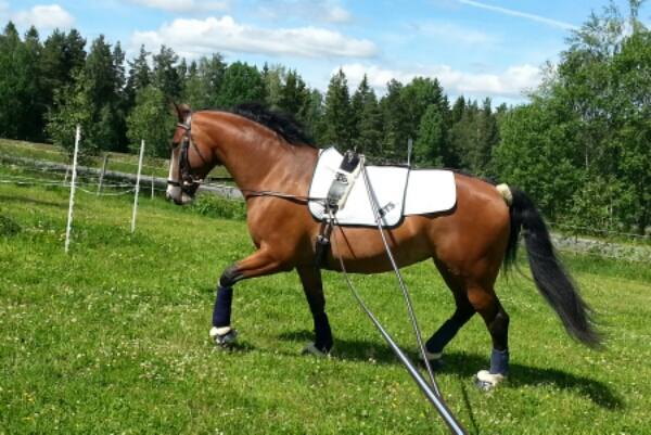 Claridge House hoppsadel med dubbelsydda Stübben stigläder, Sprenger Bow Balance stigbyglar, HKM fårskinnspad, Showmaster schabrak, Chetak hoppgjord med en Acugel pad mellan magen och gjorden.