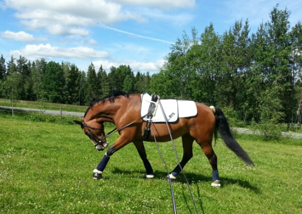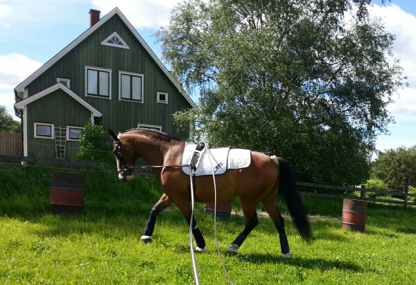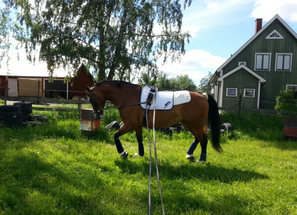 Med Dingo går det väl sisådär. Jag inbillar mig att han inte är lika halt i traven längre, men vi får se vid hans återbesök (nästa vecka) om det verkligen är bättre eller inte. Jag försöker hålla igång honom lite – mest från marken. Har dock ridit honom en gång och då skrittade vi ut tillsammans med Sara, Angelica och grannen Camilla. Vi red till ”vattenhålet” vid klätterbackarna och han fick gå igenom vattnet för första gången. Jag har tidigare lett honom genom vattenpölar, men detta var alltså första gången som han reds genom ”vattenhålet”. Han var lite tveksam så vi drog nytta av sällskapet och fick Sara och Dacke som draghjälp och då knatade han efter. Video kommer i ett annat inlägg!
