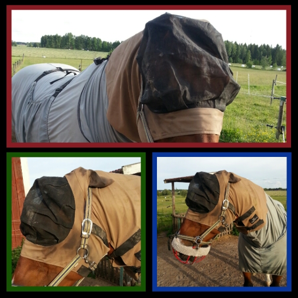 Fleecelindor (köpta på Ge-Kås) med Back on Track-paddar i fram, Jumpers Horseline kotskydd i bak, konstläderklädda neoprenboots med fårskinnskant (köpta på Eurohorse – mässan i samband med Göteborg Horse Show – av en utländsk säljare) på alla fyra hovar.