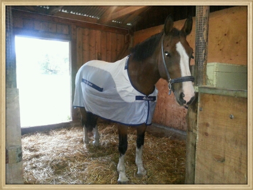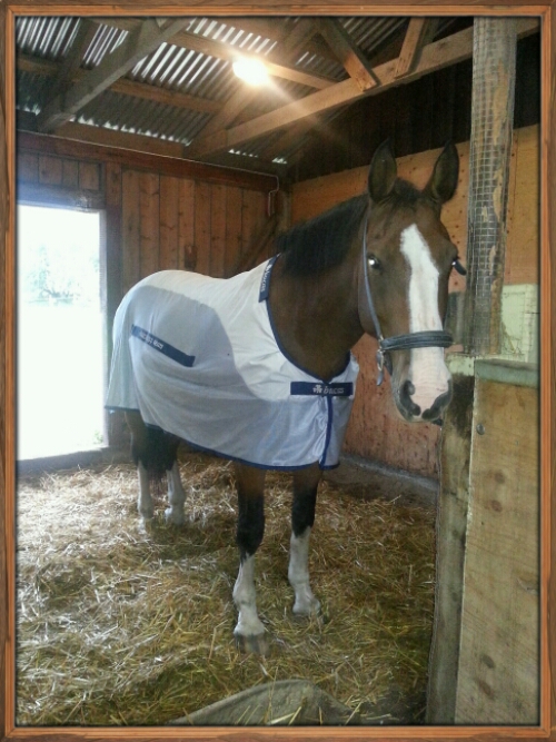 Idag invigde Alice sitt ”nya” täcke (köpt begagnat, men är i väldigt bra skick!). Det är ett Bucas Buzz-Off Rain där merparten av täcket är ett flugtäcke, men det har även ett stråk av regntäcke som skyddar hästens rygg.