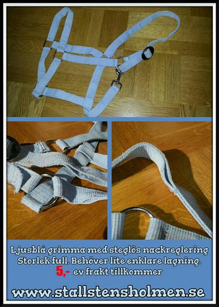 Begagnad, ljusblå grimma i storlek full. Har några skavanker (se bilderna) som jag inte orkar bry mig om att rätta till (är ju bara att sy fast igen, men jag har för mycket annat att göra) och säljes därför för endast en femma.
