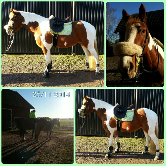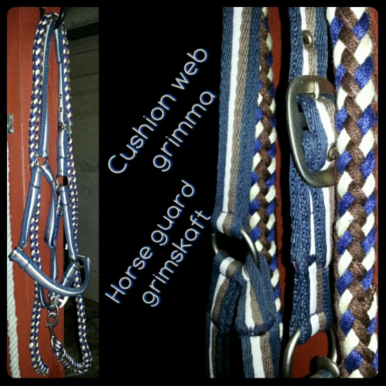 Finntack övergångstäcke med 80 grams foder, en lädergrimma (okänt märke) samt en longerlina köpt på Ge-Kås.