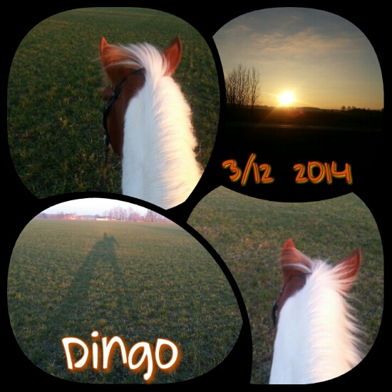 Idag red jag ut själv. På Dingo, givetvis, då jag inte litar på att Alice kommer att sköta sig på en uteritt (heheh). Jag hade tur med vädret och kunde njuta av en fin solnedgång från hästryggen. Sämre kan man ha det!