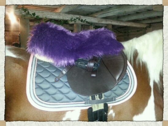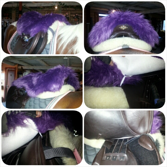 Eftersom jag har blingat bägge sadlarnas bakvalv så vill jag helst inte ha den traditionella modellen där man trär rumpvärmaren ”tajt” över bakvalvet. Jag vill inte riskera att någon sten ska lossna. Jag vek dessutom fällen dubbelt så att den skulle bli tjockare och därmed mjukare att sitta på. Den satt på jättebra under hela ridturen och var varm och mjuk!