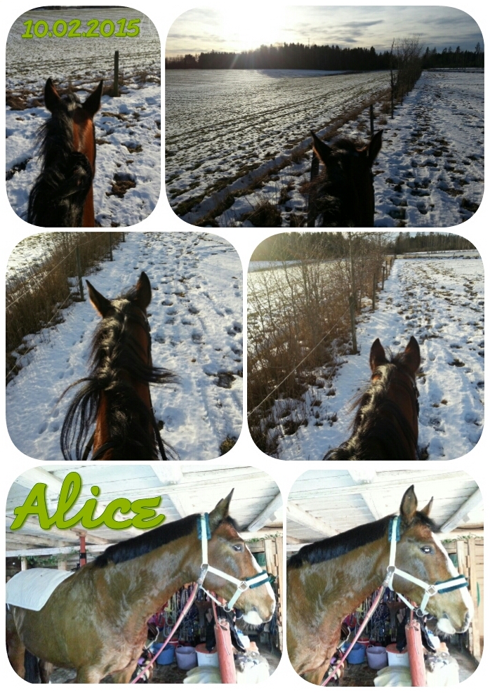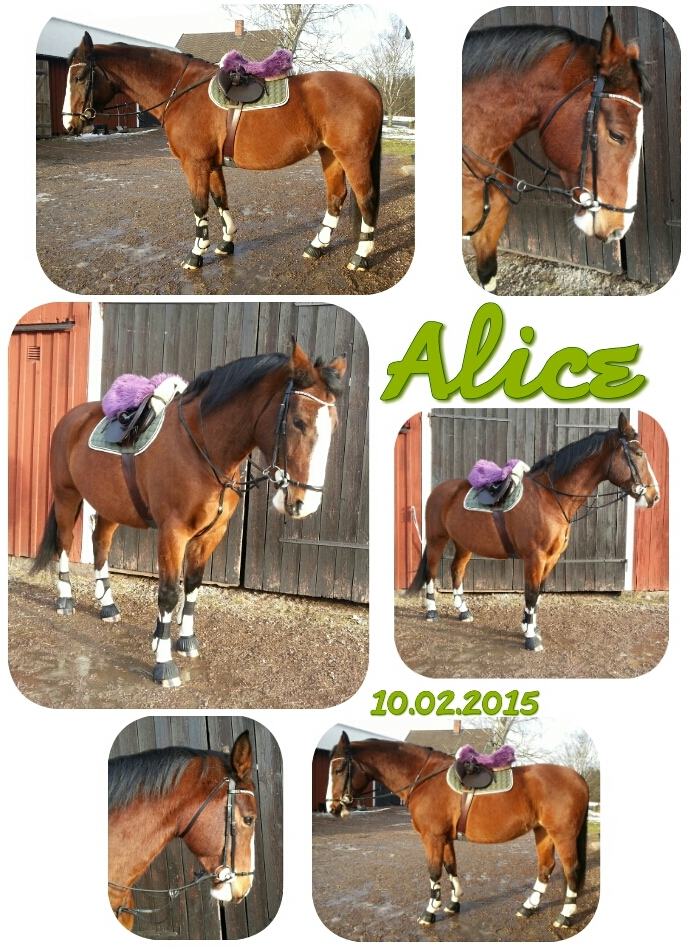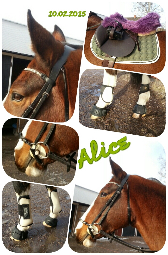 Jag var uppåt värre efter att ha ridit Dingo i härligt solskensväder och kunde bara inte låta bli att rida Alice också! Jag red i fyrkantshagen med fokus på enkelt, lösgörande arbete (i alla gångarter) såsom serpentiner, tempoväxlingar, övergångar samt lite sidvärtsrörelser. Hon var jätteduktig och på väldigt bra humör – även hon.