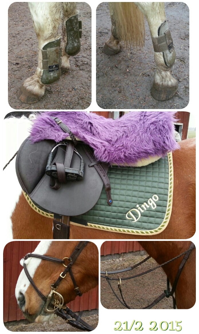 Claridge House hoppsadel med dubbelsydda Stübben stigläder, Sprenger Bow Balance stigbyglar, hoppgjord (vet ej märke), HKM fårskinnspad, Lyckås schabrak, egengjord rumpvärmare.