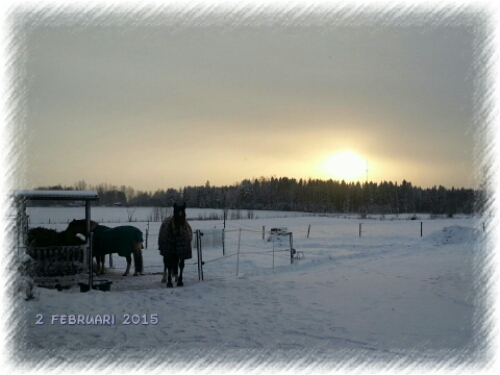 Dagen efter att jag red Alice så var det Dingos tur att motioneras. Det blev körning/tolkning med ”släden” och jag kan inte säga någonting annat än att både han och jag verkligen tyckte att det var roligt! Detta trots att jag denna gång råkade glida av släden, vilket är väldigt lätt hänt då den är liten och dessutom så är överdragsbyxor, snö och plast en väldigt dålig kombination!