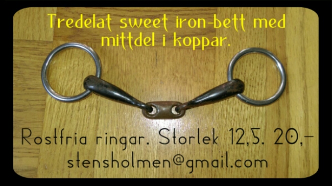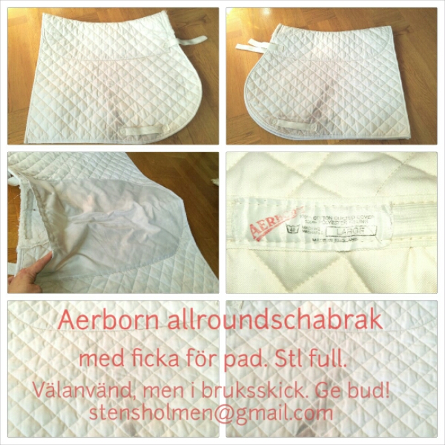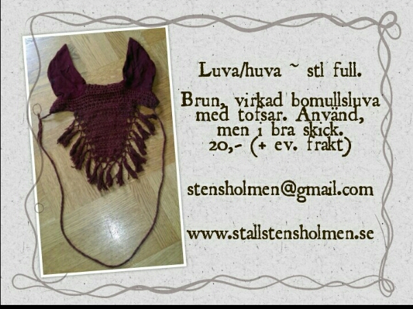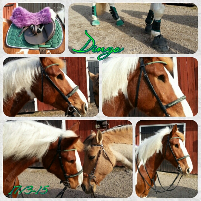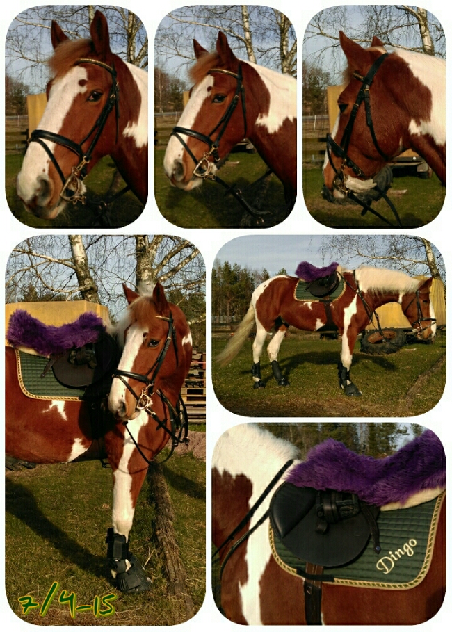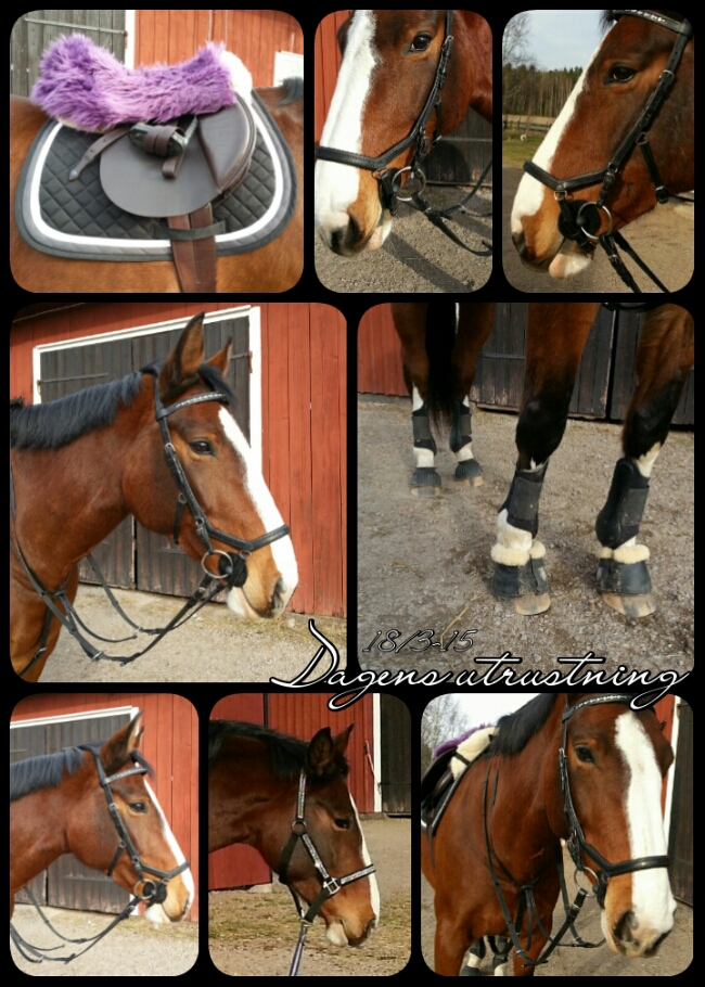 Ihopplockat träns med Claridge House pannband och nosgrimma, huvudlaget är Globus (tror jag), Jacson tyglar och Jacson syntetbett med mässingsringar.