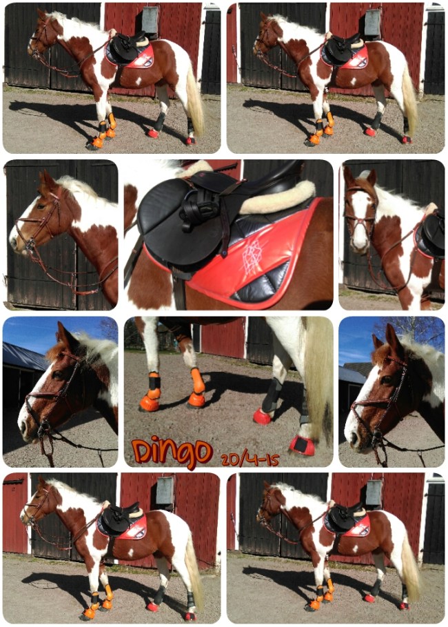 Den tjugonde april var det Dingos tur att stärka musklerna genom klättring. Men, till skillnad från Alice så jobbade jag honom ute i skogen. Det blev även lite plaskande i ”vattenhålet”! Vi hade sällskap av Angelica och lille, söte Köla. Bortsett från att Dingo förstörde en av barfotabootsen när vi klättrade i skogen så gick ritten riktigt bra både för mig och Angelica!