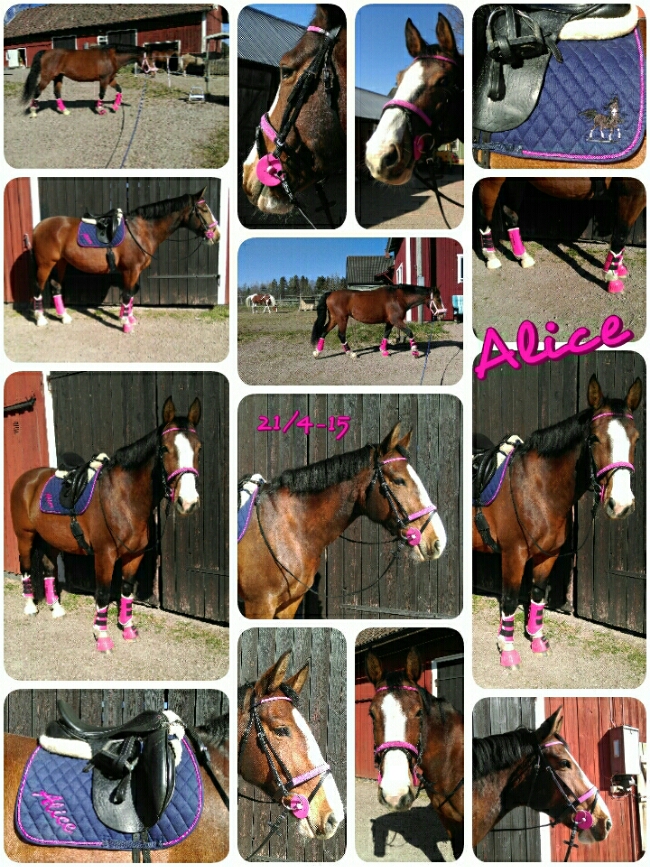 Arabian Eclipse dressyrsadel med dubbelsydda Prestige stigläder, Sprenger Bow Balance stigbyglar, HKM fårskinnspad, Eric le Tixerant sadelgjord samt ett schabrak broderat med ”Alice” på ena sidan och motiv designat av Lena Furberg på andra sidan.