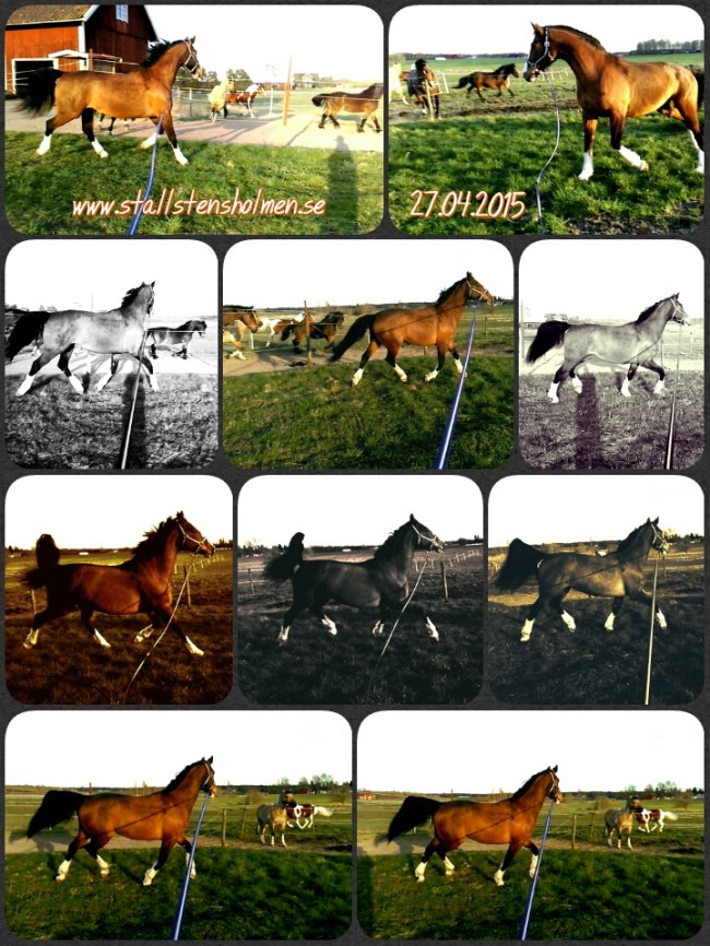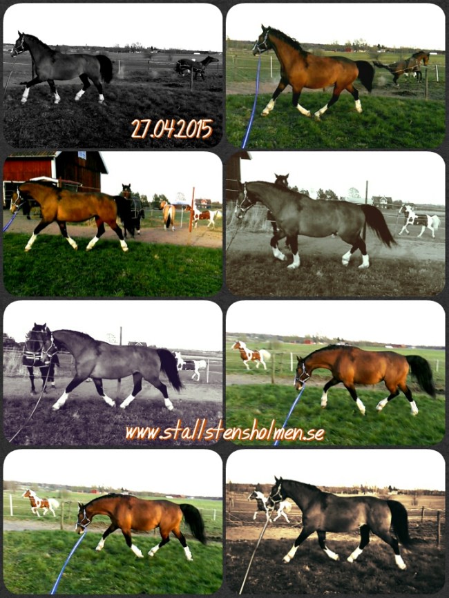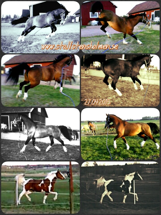 Den 27 april skulle jag longera Alice lite i skritt och lätt jogging, men det gick ju inte riktigt som jag hade tänkt mig – som ni kan se på bilderna… Det blev ett smärre kaos! Av någon anledning så fick de andra hästarna fart när de såg att jag longerade Alice och när de satte igång så satte ju givetvis även hon igång. Självfallet så hakade Dingo på också! Han gick nämligen i hagen bredvid ”gubbarna” och skulle ju inte missa ett tillfälle att springa och busa!