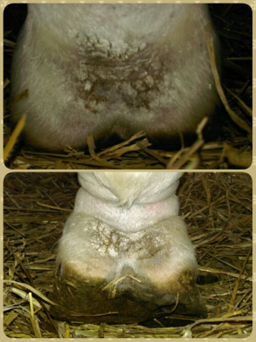 Jag har ingen aning om varför hon fick det, men det började i små trampskador som hon hade (en på vardera bakben) och spred sig sedan snabbt över hela karleden. Stackars lilla gumman…