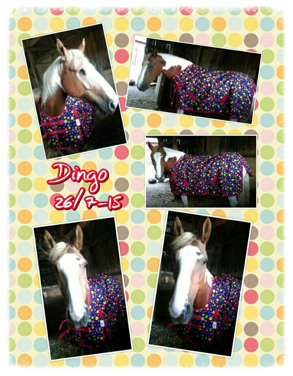 Tyvärr fanns detta coola fleecefodrade regntäcke bara i storlekar till och med 135 och det blev i kortaste laget för Dingo. Men, det går ju i alla fall.