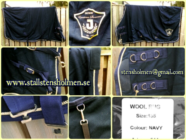 Helt NYTT (dock lite hår på insidan efter att det provades i stallgången), lyxigt Jacson ulltäcke med fleece på insidan. Två täcken i ett! Marinblått med guldfärgad rep-passpoal. Dubbla, ställbara snabbspännen samt kardborrfäste i fram. Kryssgjordar. Storlek 135.