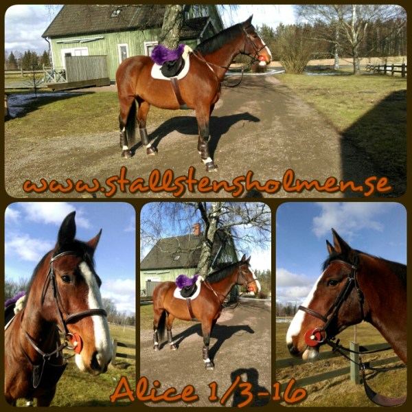 Idag red jag Alice i stora hagen och det var klättring som stod på schemat. Underlaget är fortfarande hårt och ojämnt så det blev i princip bara skrittarbete, men skritt kombinerat med klättring ger ändå riktigt bra träning. Alice skötte sig riktigt bra, även när hon såg Dacke springa i hagen bredvid samt att hon fick syn på att grannhästarna busade i hagen. Hon spände upp sig lite, men gjorde inget utöver det. Och – detta trots att jag inte hade longerat henne innan ridningen. Duktig snutta-plutta!