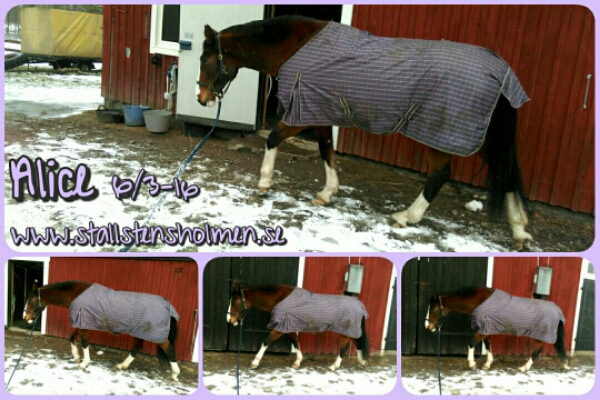 Idag höll jag mig på gårdsplan så att hon verkligen skulle hålla sig till skritt och inte busa. Eftersom hon bara skulle skritta och att det snöade ganska mycket så fick hon ha täcket på sig.