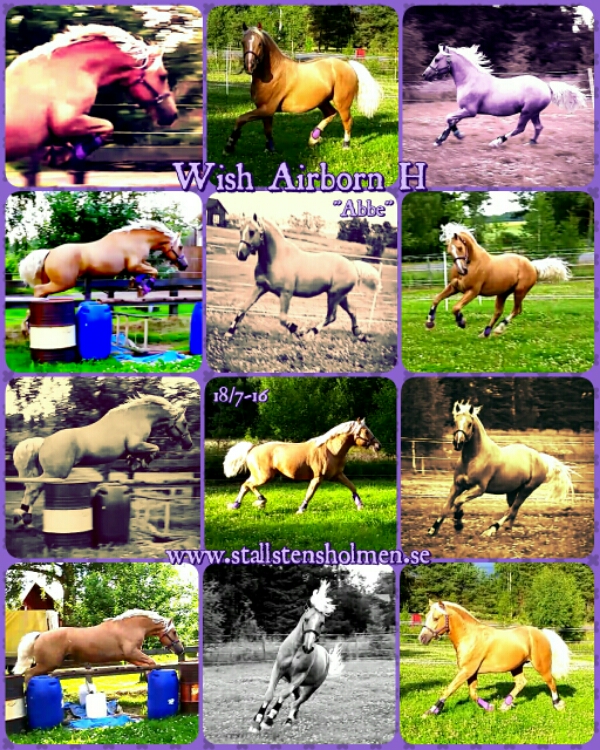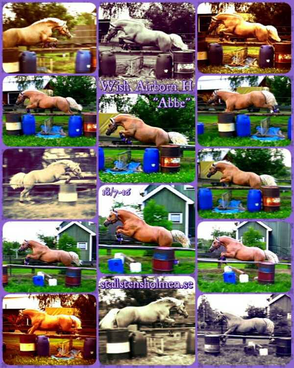 Den 14:e och 18:e juli fick Abbe bekanta sig med mina hinder och lära sig att löshoppa. Första dagen höll jag mig till markbommar och vattenmatta (utan hinder över) bara för att han skulle lära sig att vattenmattan inte är farlig och vad jag vill att han ska göra.