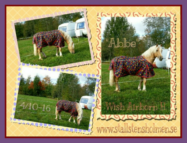 På bildeena har Abbe sitt coola, färgglada, fleecefodrade regntäcke på sig. Täcket är köpt på Ge-Kås.