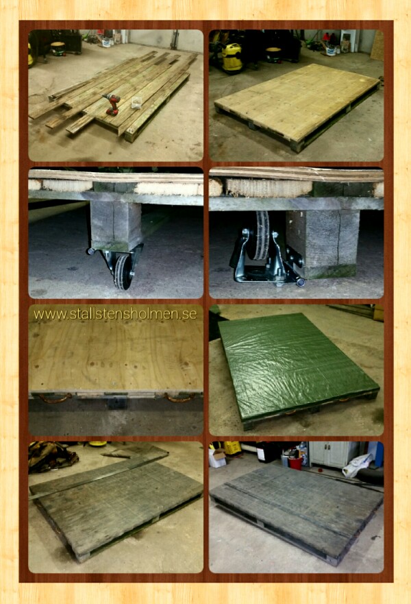 Jag utgick från en stor lastpall, skruvade fast fler brädor och sedan en byggskiva ovanpå det. Därefter fick jag hjälp av Magnus att få dit ett fällbart hjul för enklare förflyttning (för den är tung!). På motsatt sida satte vi två handtag för ett behagligare och säkrare grepp vid förflyttning.