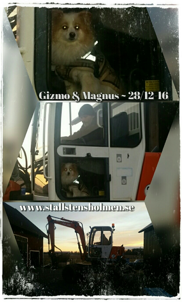 Gizmo är ju för rolig! Han älskar att åka allt utom bil. Igår fick han åka i Magnus hjulgrävare för första gången och han såg ut att stormtrivas.