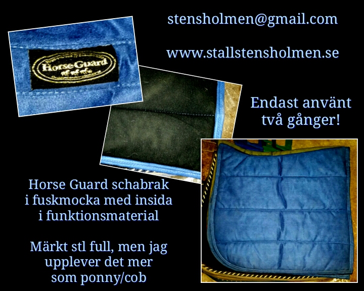 Blått Horse Guard schabrak i fuskmocka med insida i funktionsmaterial. Märkt som dressyr storlek full, men jag upplever det mer som ponny/cob om man vill ha det till dressyrsadel. Funkar annars till hopp-/allroundsadel. Mycket bra skick då det endast är använt två gånger!
